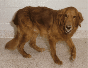 Muscular Dystrophy (MD) is a mutation of the dystrophin gene that causes a deficiency of dystrophin proteins in Golden Retrievers. The lack of dystrophin proteins leads to the progressive degeneration of skeletal and cardiac muscles. The disease is similar to the human disease, muscular dystrophy. Symptoms appear relatively quickly, at about six weeks to two months of age. A dog with muscular dystrophy will exhibit muscle weakness, difficulty standing or walking normally, and difficulty swallowing. Symptoms can range from relatively mild to severe, but MD is generally fatal at about 6 months of age.